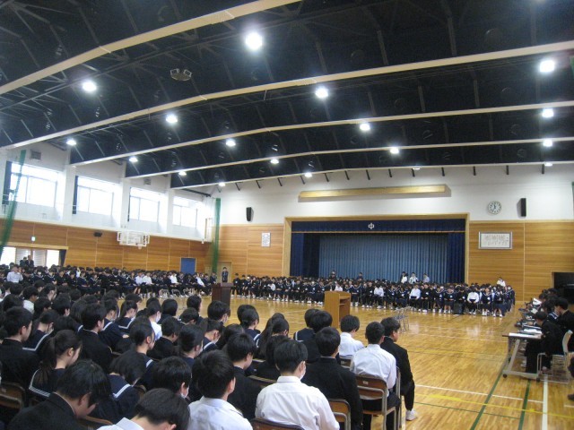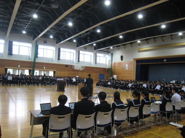 生徒会から今年度の活動方針や各委員会の前期活動計画が発表され、生徒たちは真剣な表情で耳を傾けていました。
