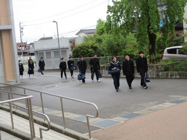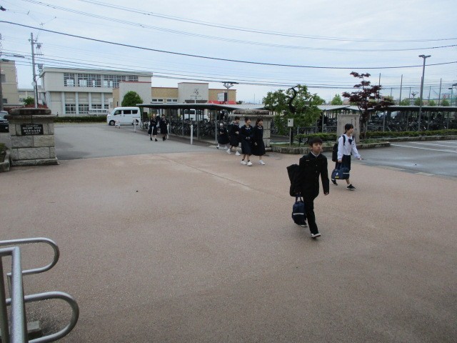 今朝の登校時は曇りになりました。今日は6限に小学校の先生方が1年生の授業を参観され、小中連絡会を行います。本日の下校完了時間は15:15です。