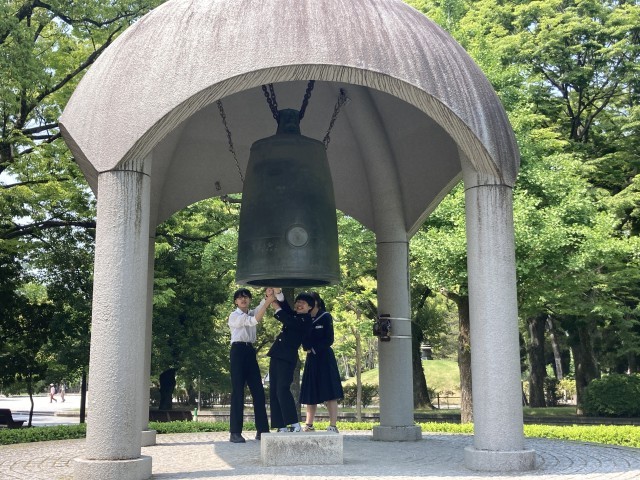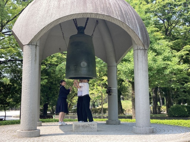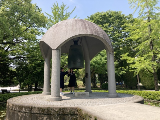 広島平和記念公園で班別学習をしています。平和の鐘を鳴らし、平和への思いを深めました。