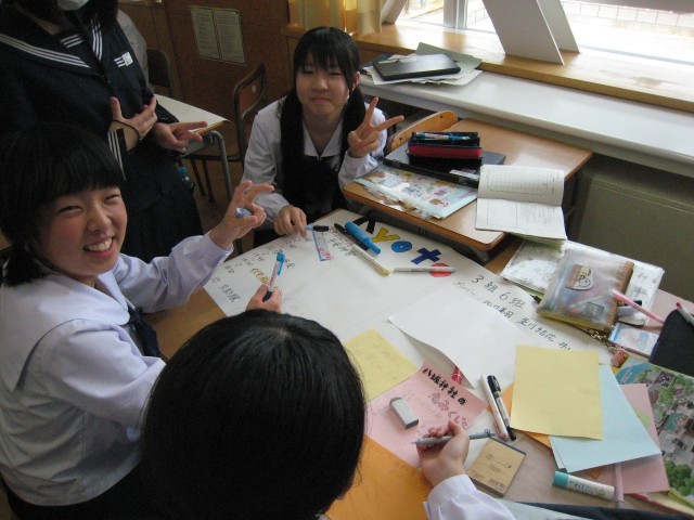 午後からは、京都タクシー班別学習のまとめを班ごとに模造紙に書きました。
