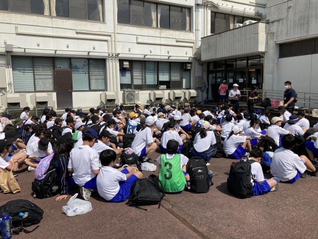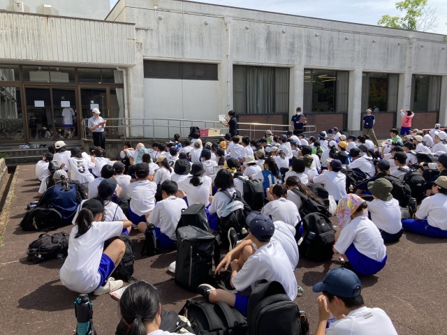 オリエンテーリングの説明を聞いています。暑い中ですが、水分補給をしっかり行い、協力して頑張ります。