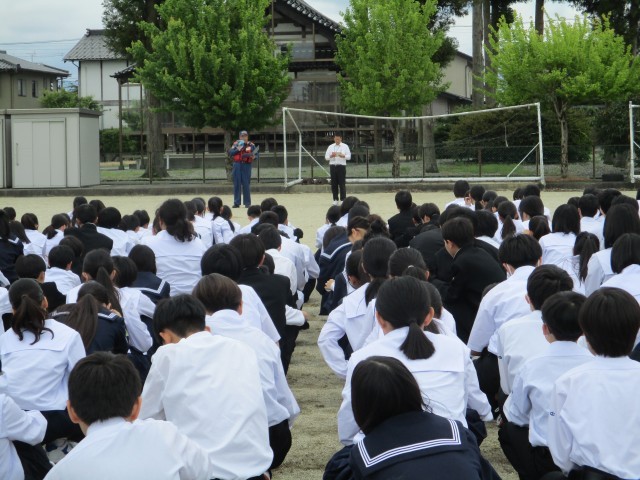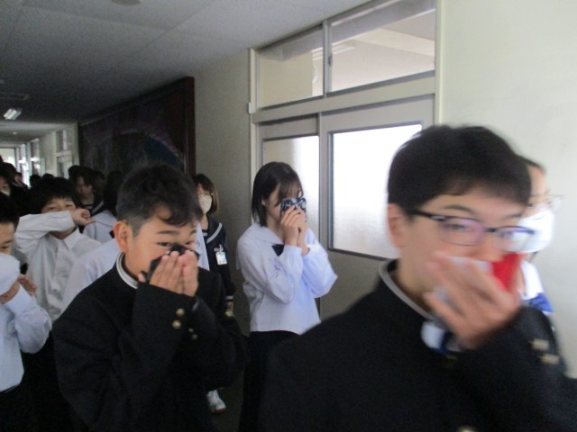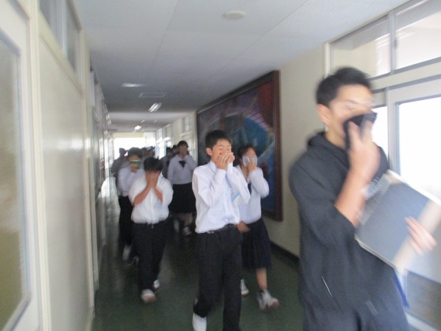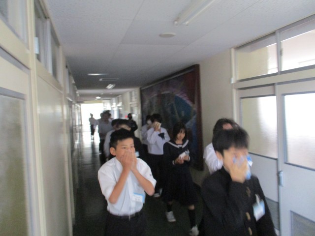 避難訓練がありました。ハンカチをしっかりと口に当てて、静かに避難していました。消防署の方のお話も真剣に聞いていました。