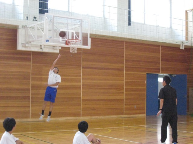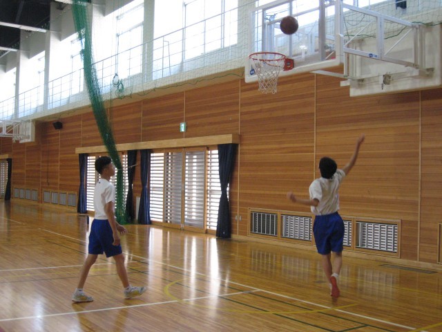 体育館では7組の生徒が元気にバスケットボールをやっています。今日のテーマは「レイアップシュート」で、互いのフォームを確認しながら楽しく取り組んでいます。