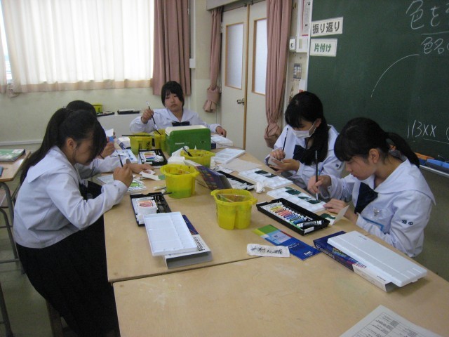 1年3組の美術では、「カラー図鑑をつくろう~色をそっくりにするにはどうしたらよいだろう~」という学習課題のもと、身近なものとそっくりな色をつくるために、絵の具を試行錯誤しながら混ぜていました。カーテンの色味を出すには?壁とそっくりな色合いを出すには・・・?取り組む生徒も自然と協働的に話し合ったり作業したりしていました。