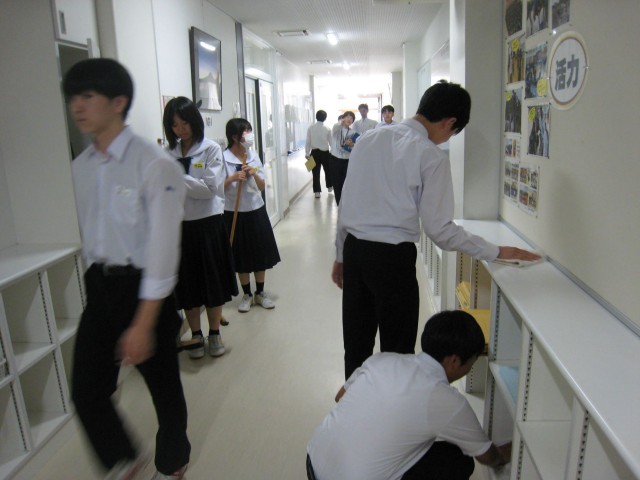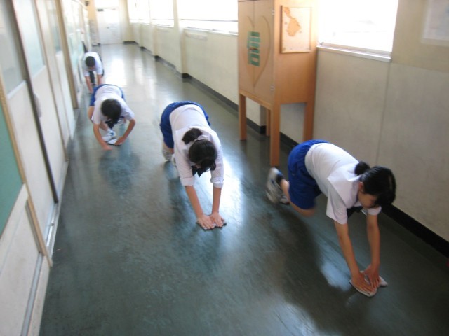 毎週月、水、金は清掃があります。週明けの1日目、教室や廊下にたまったほこりをきれいにしています。