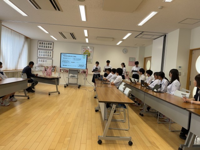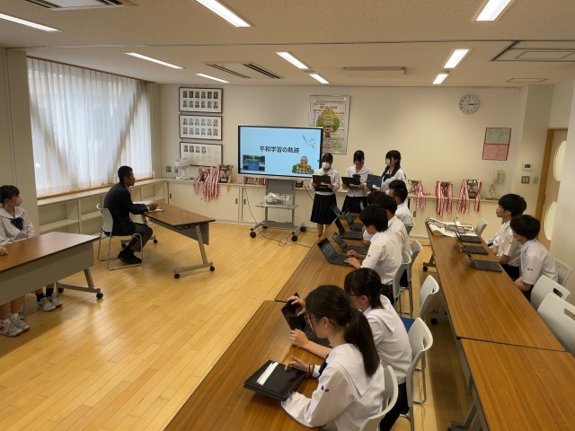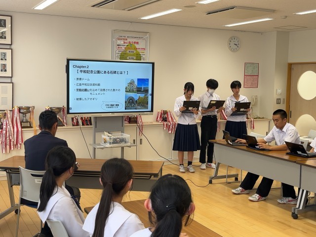 昨日、3学年の平和プロジェクトチームが、これまでの平和学習や修学旅行広島平和セレモニーの様子などを、鍋田校長へ報告しました。