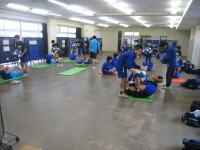 陸上競技部は、あいにくの天候で多目的ホールBにて、メディシンボールを使った体幹...