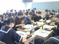 2年生の書初大会の様子です。2年生は「文学の地」と行書で書いていました。教室の中はシーンと静まり返っており、静粛な雰囲気の中で課題に取り組んでいました。教卓の上には冬休みの課題が高々と積まれていました...