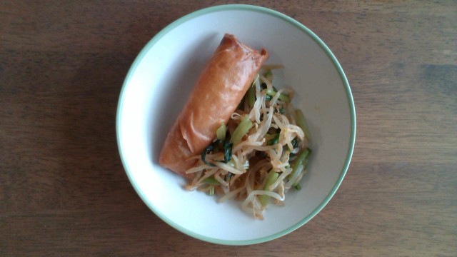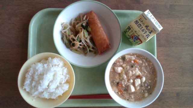 【本日の献立】 小松菜ひたし えびと豆腐のうま煮 春巻き RICE MILK