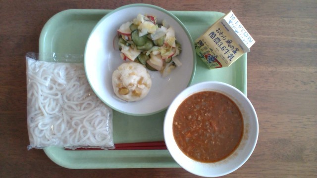 【本日の献立】 ソフト麺のカレーソース 蒸しパン 白菜とりんごのサラダ 牛乳