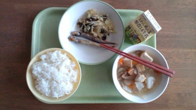 【本日の献立】 みそけんちん汁 ししゃもの米粉揚げ わかめサラダ RICE MILK