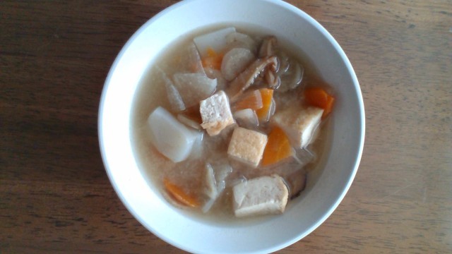 鎌倉市の建長寺でふるまわれる「建長汁」がいつしか「けんちん汁」になったという説があるそうです(他説も有り)。大抵は醤油ベースとのことですが、本日のように味噌で味付けする場合もあるようです。