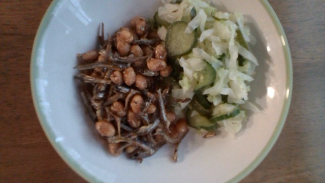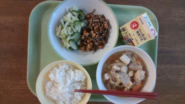 【本日の献立】 小魚入りフライビーンズ きざみ和え はくさいなべ RICE MILK