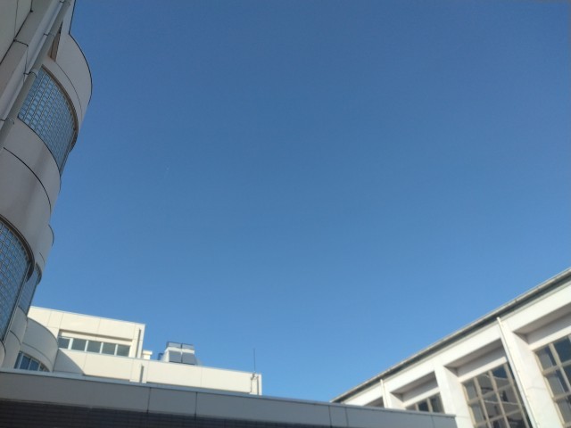 神宮球場へ誘われる(いざなわれる)ような紺碧の空の朝です。写真では殆ど見えないのですが、飛行機がコントレイルをたなびかせながら青空を泳いでいました。