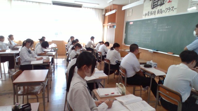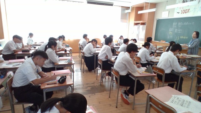 1組は数学、2次関数。変化の割合についての問答中でした。目に入る数字を、しっかりと関数の式に代入するという基本を忘れなければ大丈夫。