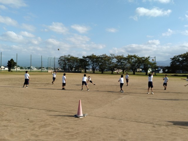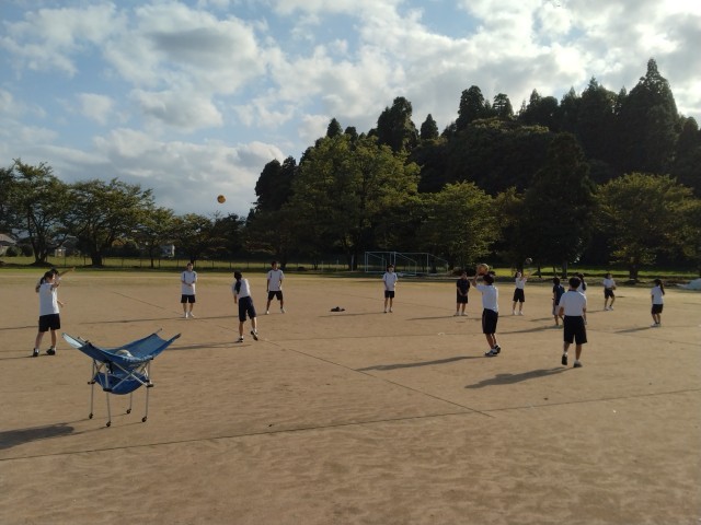 グラウンドでバレーボール・・・昭和の香りが漂う中、アンダーハンドを中心に対面トス。30秒間地面に落とさずに!という指示のもと、楽しそうに且つ一生懸命取り組んでいました。