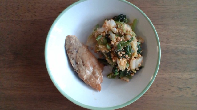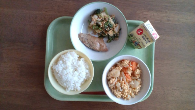 【本日の献立】 さばのみそ煮 いり大豆和え 卵とじ RICE MILK
