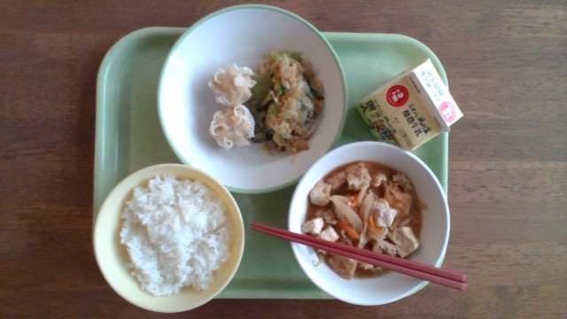 【本日の献立】 コーンシューマイ 香味和え 厚揚げのうま煮 RICE MILK