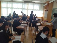 13:30から、武道場で公開授業(3年1組 保健体育 柔道)を行いました。大勢の学校関係者の見守る中、連続技に係る約束練習が始まります。まずは、ウォーミングアップ代わりの受け身から。