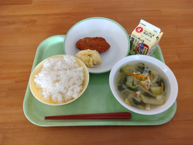 【学校給食週間2日目】 ABCマカロニスープ(写真がぼやけてしまいました) チーズポテト 白身魚のフライ RICE MILK