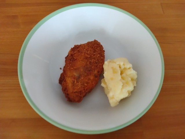 英語にまつわる献立です。お皿に乗っている白身魚フライとチーズポテトは、イギリスの伝統料理であるフィッシュアンドチップスを模してのものになります。スープの中からは、いくつかのアルファベットを発見することができました。