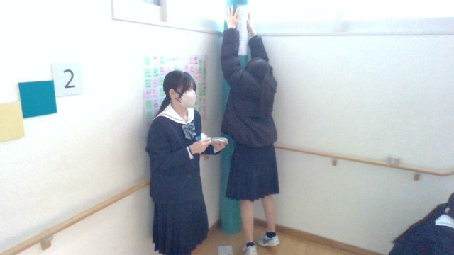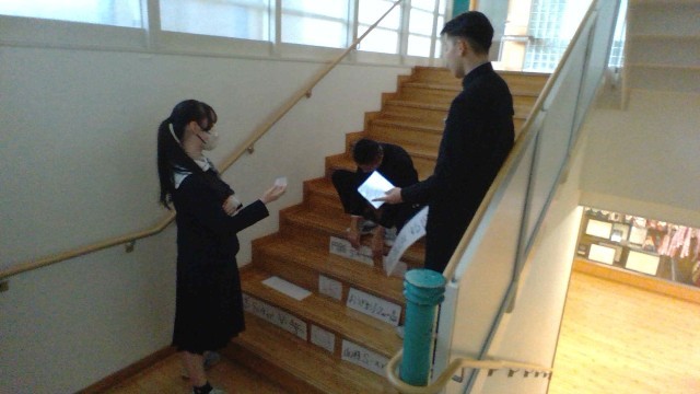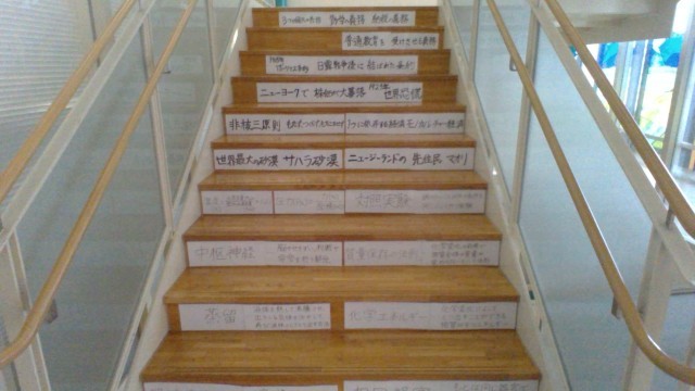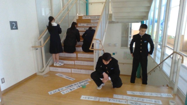 2月5日(木) 3年生 「貢献プロジェクト」 公開日 2026/02/05 更新日 2026/02/05 3年生の活動より 3年生は、学校教育目標にある文言「自立」「共生」「貢献」のうち、「貢献」に重点を置いています。各学級が卒業を前に行っている「貢献プロジェクト」の活動の様子です。 3年1組では、階段に5教科の重要用語や公式等を貼る「学びのステップアップ階段」を企画しました。毎日この階段を使うことで、自然と反復学習ができる環境を整えました。 城中生全員の学力アップを期待したいですね! +1