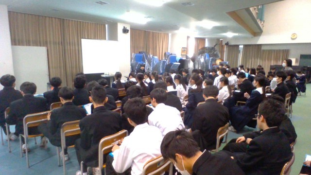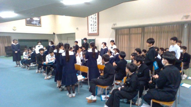 前半は、総合的な学習の時間に取り組んできた「職業調べ」のクラス代表によるプレゼンテーションを行いました。各代表者は、自ら調べた職業の魅力や必要な能力について発表し、聴いている生徒たちにとっても、将来のキャリアについて視野を広げる貴重な刺激となりました。