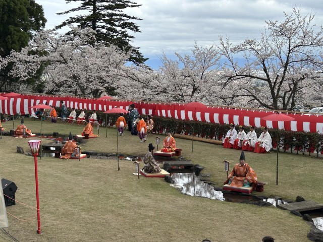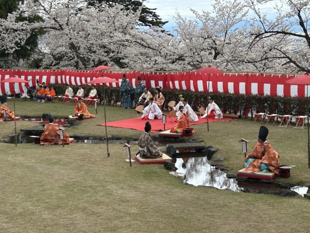 4月5日(日)満開の桜が咲き誇る婦中ふるさと自然公園、各願寺で曲水の宴が催されました。
