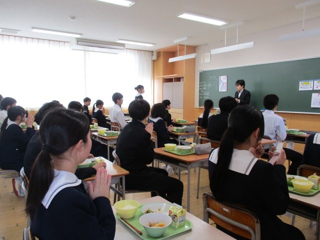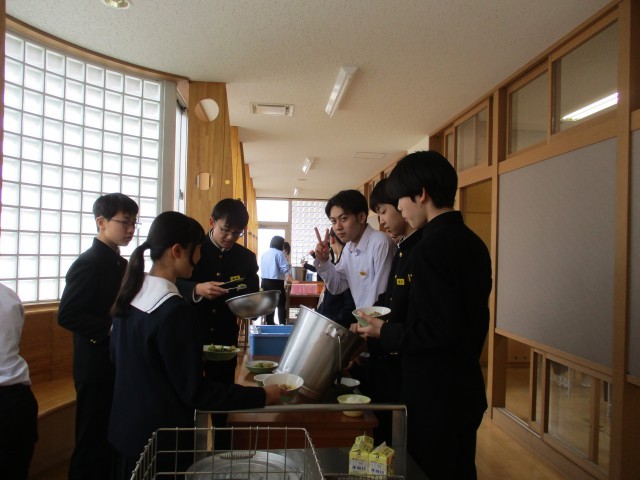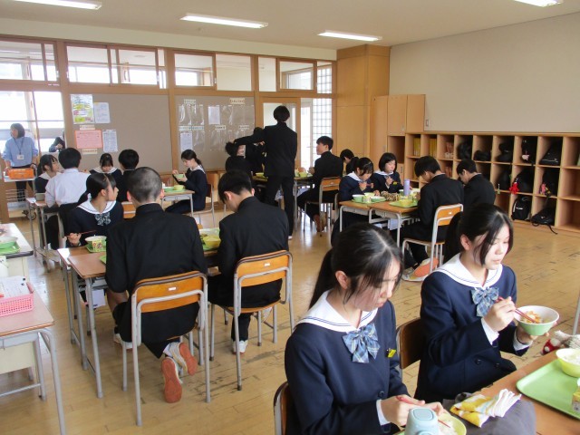 給食の準備も協力して行い、早めの「いただきます」となりました。食欲旺盛です。お代わりする人がたくさんいます。