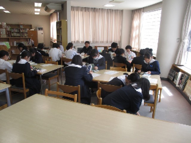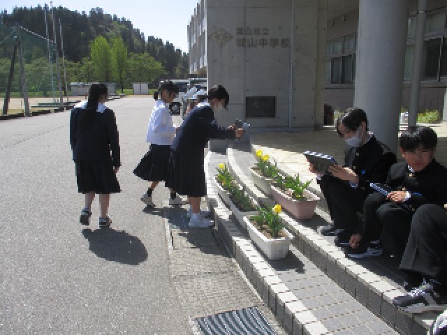 5限目の1年生の授業の様子です。写真左は1組は保健体育の授業で、体力テストの説明がありました。写真真ん中2組は理科の授業で、校庭の植物をタブレットで撮影しました。写真右3組は国語の授業で、図書室で本を借り読みました。