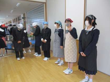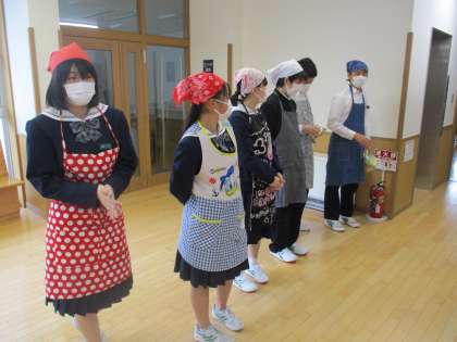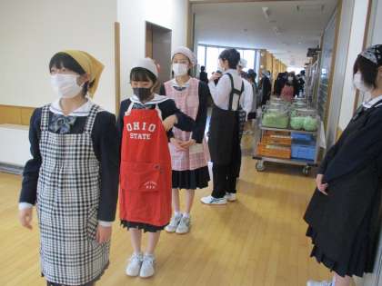 給食の準備の前に、各クラスの給食当番は整列して身支度のチェックと手指の消毒をします。今日も素早くがんばってくれました!