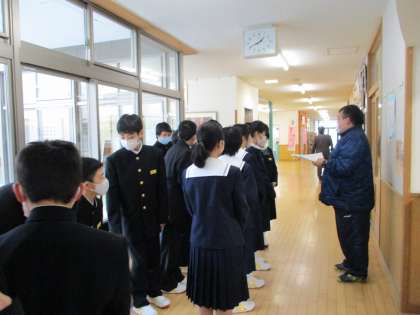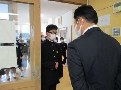1年3組が校舎巡りを行いました。職員室の入退室では、教科担当の先生に明日の予定を教えてもらいました。