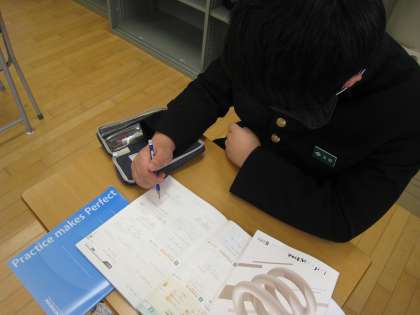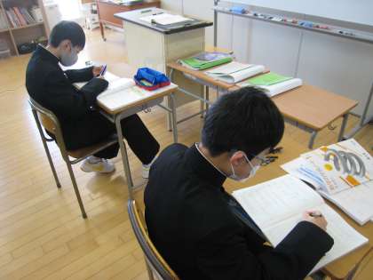 1年生は正負の数の加法の計算を、3年生は乗法公式利用した展開の計算問題に集中して取り組んでいます。