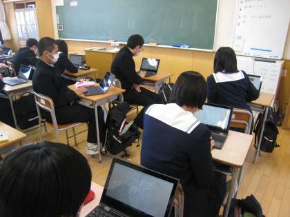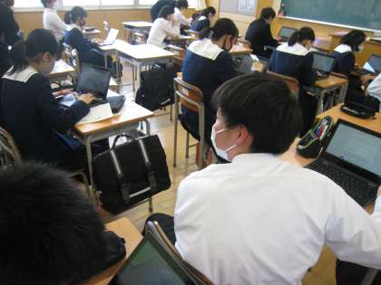 3年生は午後から歯科検診がありました。検診が終わった生徒から、クロムブックを利用して、「生活アンケート」や今日の午前中に実施された「情報モラル講座アンケート」に答えていました。操作でわからない部分はお互いに確認し合っている様子が見られました。