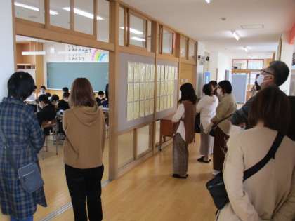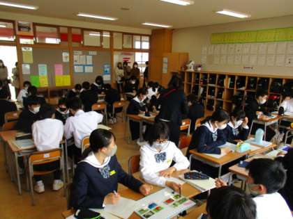 昆虫や植物の分類について考えています。グループで真剣に考えを出し合っています。