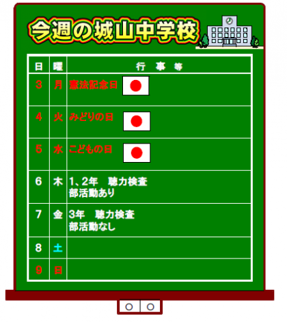ゴールデンウィークですね。家でどのように過ごしていますか。生活リズムを整えて、規則正しい生活をしましょう。もちろん「マスクの着用」「3密を避ける」「手洗いの徹底」等の感染症対策について、時と場合に応じて適切に行いましょう。