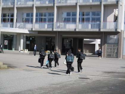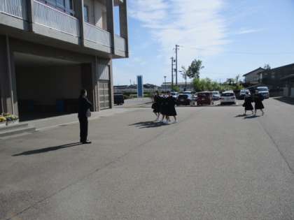 連休明けの朝は、とってもよい天気となりました。そんな中、城山中の子どもたちは、元気に登校しています。「おはようございます」の元気な声が、玄関前に響き渡っています。