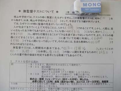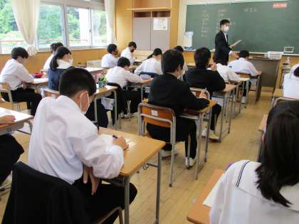 1学年では来週から始まる中間考査より、無監督でのテストを実施します。そこで、無監督テストの意義やテストの流れについて確認しました。ぜひ、誇れる自分を見つけ、美しい心を育てていきましょう。