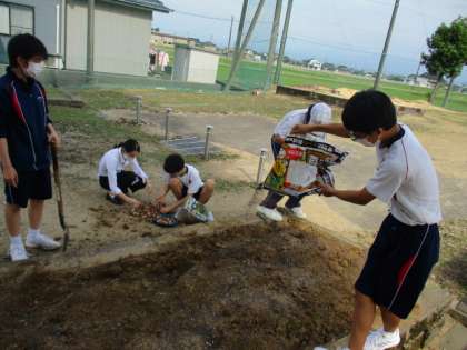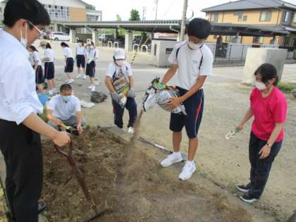 続いて花壇の土作りです。額に汗を浮かべながら、一生懸命取り組んでいます。