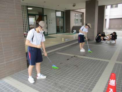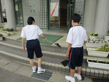 ボランティア委員は、苗植えが終わった後片付けにも丁寧に取り組んでいます。こぼれた土を確実に掃き取り、みんなが気持ちよく過ごせるようにしています。こんなところにも、城中生の優しさを感じます。