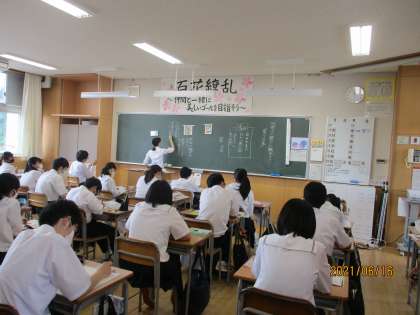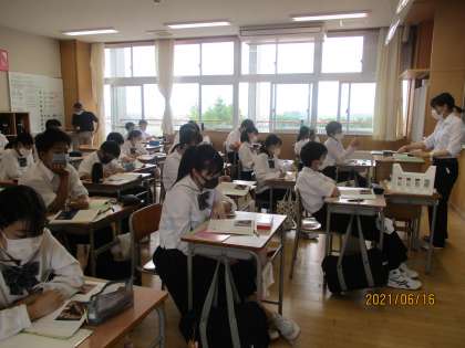 本日の2年1組の道徳は、教育実習の先生の授業でした。題材名「祭りの夜」。祭り見物に訪れた県外の人から「忘れられない竿灯祭りになった」と言われた作者が郷土の良さを再確認するというお話です。授業の最後に県外出身である先生が「富山の魅力を教えて」と言われ、生徒たちは、自慢できるいろいろな所を思い出しながら一生懸命ノートに書いていました。