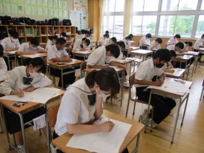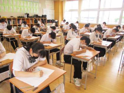 3年生は実力テスト2日目、英語と数学に取り組んでいます。目が真剣です。