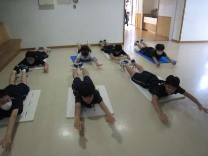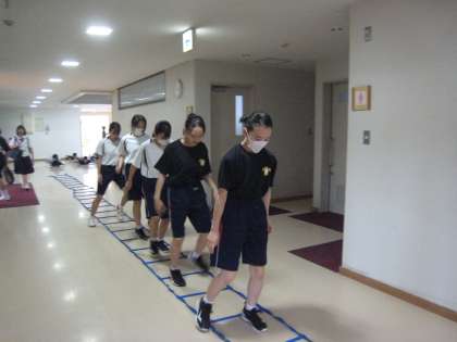 バドミントン部、バレー部の活動の様子です。蒸し暑い中、がんばっています。