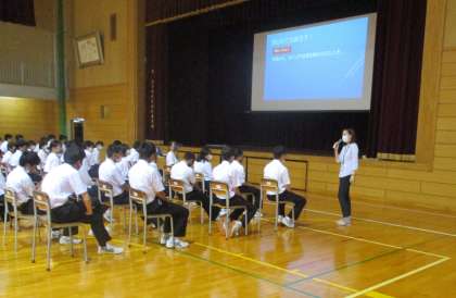 富山県警少年サポートセンターから講師の方をお迎えして、お話を伺いました。薬物に対する正しい知識を持ち、「ダメ、ゼッタイ!」を合い言葉に、断る勇気を持つことが大切だと教えていただきました。