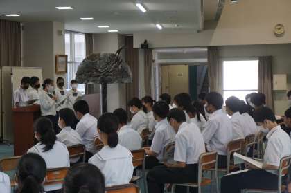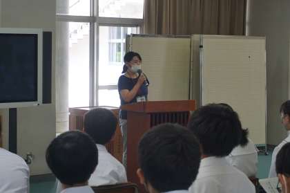 前期生徒会執行部による「1学期の振り返り及び2学期に向けて」が行われたあと、先生方から夏休みの過ごし方等についてお話がありました。
