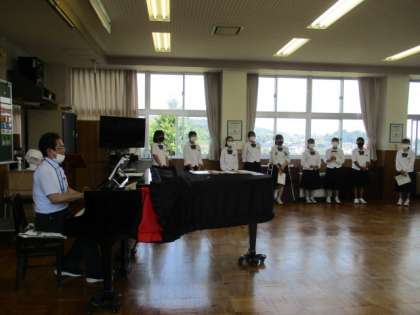 上:2年1組 音楽で、合唱の前に発声練習をしています。