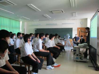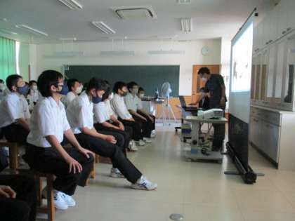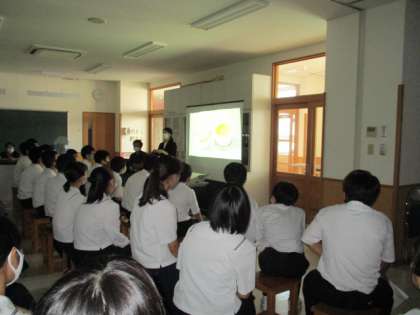 5限6限と青年会議所から二人の先生を招いての講演を行いました。デザイン会社で、商品のパッケージのデザインをしておられる方と、県内に2店舗美容室を展開しておられる方が講師でした。お二人とも夢を持つことの大切さと努力の大切さを説いておられ、生徒たちは熱心に聞き入っていました。