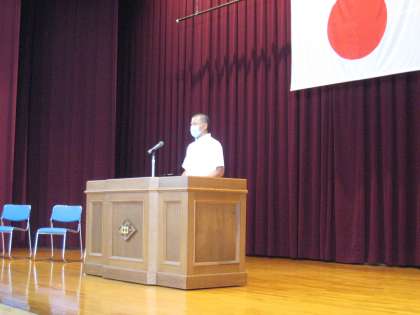 校長先生から、式辞がありました。夏休みは、読書をして「頭」を、適度な運動をして「体」を、そしてボランティアや家族のお手伝いをして「心」を鍛えてくださいとお話がありました。