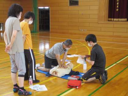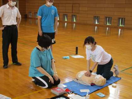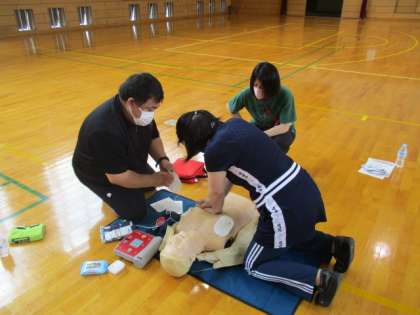 教職員を対象に、AED講習会を行いました。何度も受けてきた講習ですが、毎年講習を受けることで、いつどんなことが起こっても対応できるように備えています。婦中消防署の方に教えていただきながら、真剣に取り組みました。