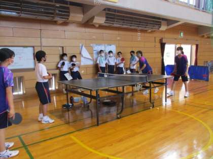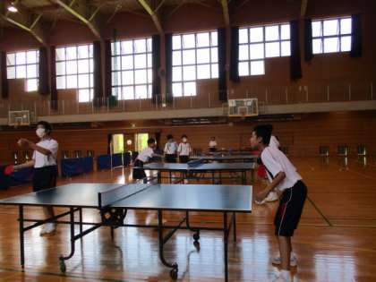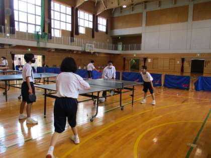 体育館で、暑い中卓球部が活動していました。2年生が1年生にダブルスのルールを教えていました。